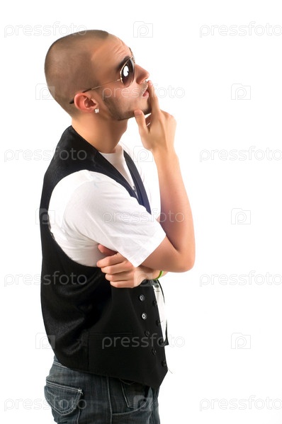 Портрет о чем-то размышляющего молодого человека в темных очках, на белом фоне