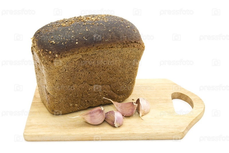 Черный хлеб и чеснок на разделочной доске на белом фоне