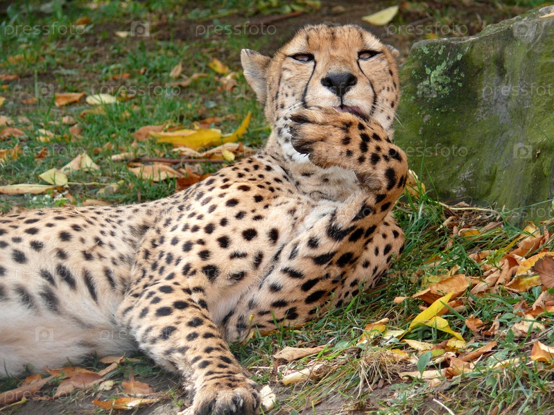Леопард лижет лапу