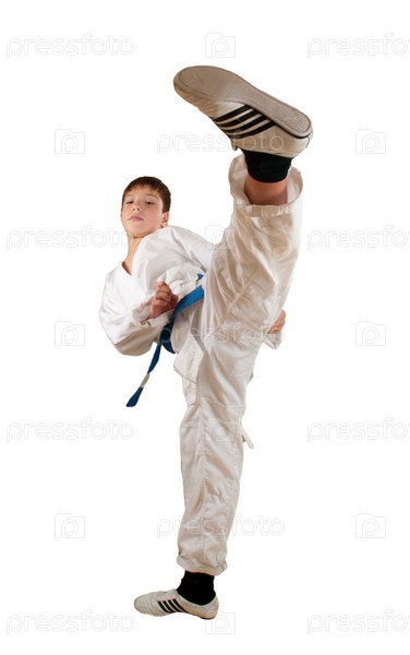 Мальчик выполняет прием каратэ
