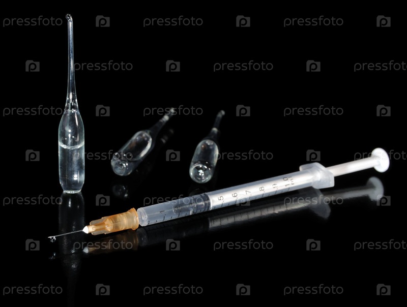 Медицинский флакон и шприц на черном фоне