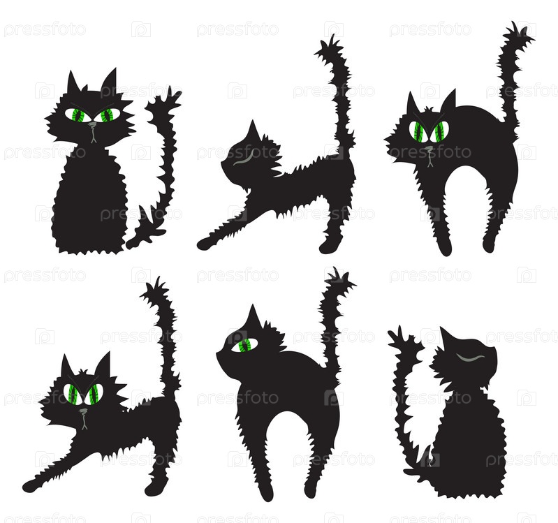 Шесть черных кошек в различных позах