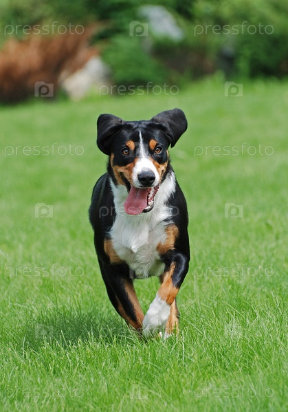 Аппенцеллер зенненхунд, бегущий по зеленой траве