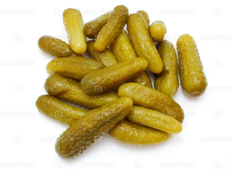 Много соленых огурчиков на белом фоне