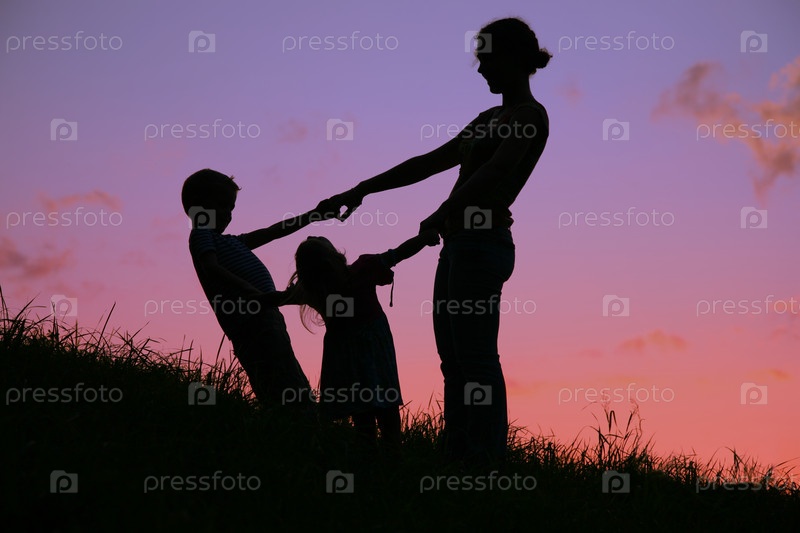 Мать с детьми на фоне заката