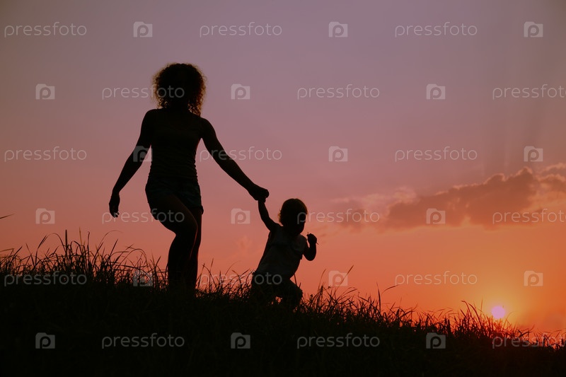 Мать с ребенком на фоне заката