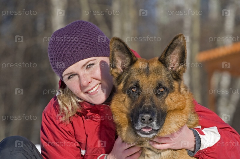 Молодая женщина обнимает немецкую овчарку