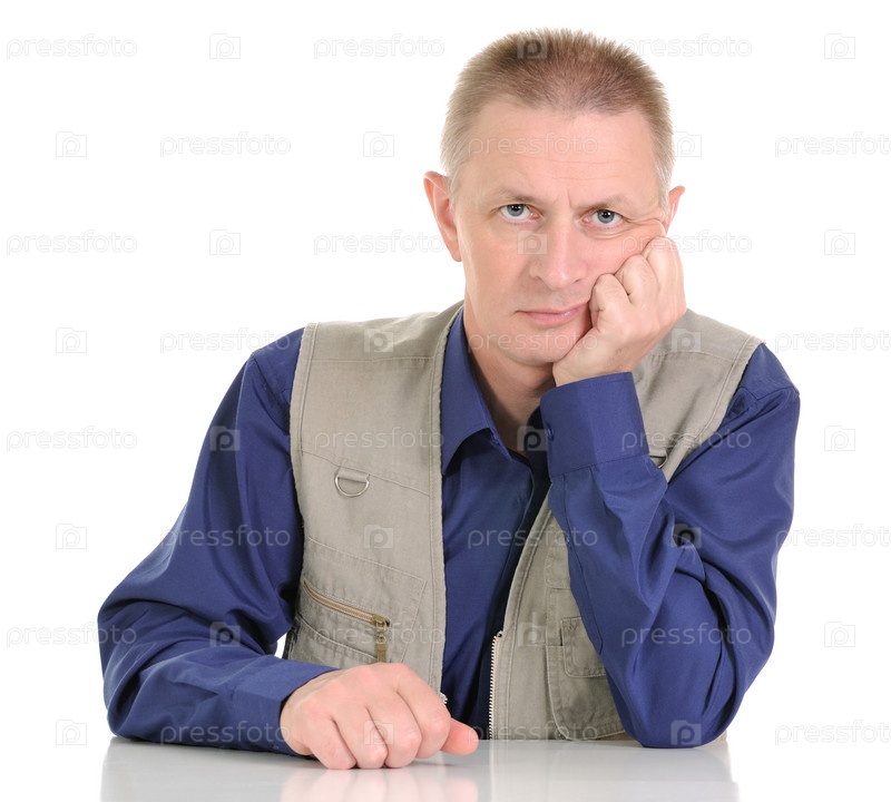 Уставший мужчина средних лет на белом фоне