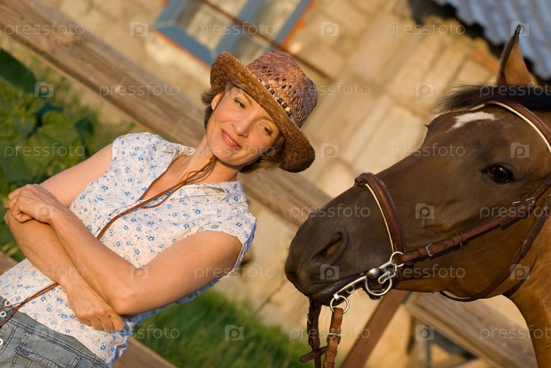 Женщина в шляпе стоит рядом с лошадью