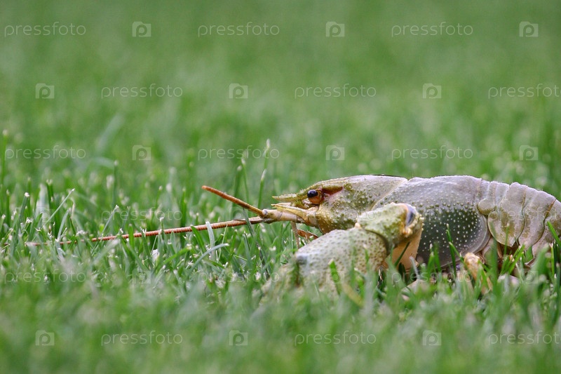 Речной рак, лежащий в зеленой траве