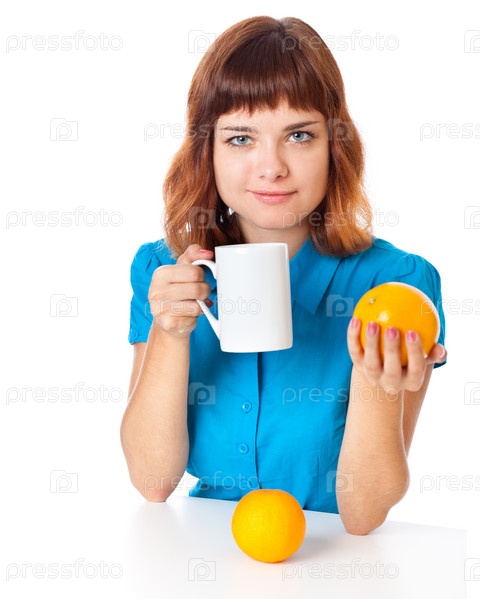 Девочка-подросток с чашкой кофе и двумя апельсинами. Изолировано на белом