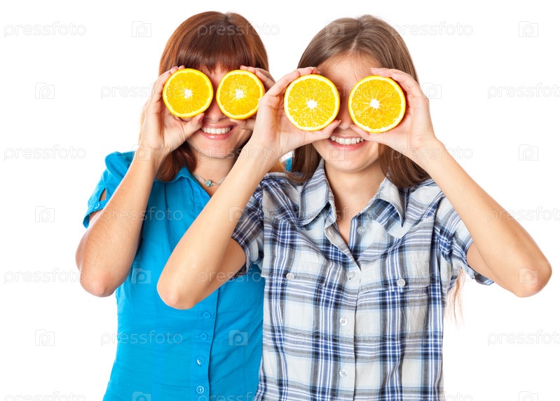 Две девушки смотрят через апельсины. Изолировано на белом фоне