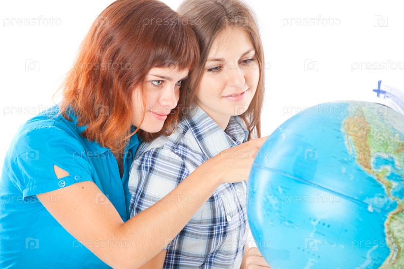Две девушки смотрят на глобус. Изолировано на белом фоне
