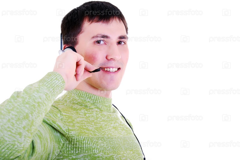 Молодой человек разговаривает по телефону при помощи гарнитуры