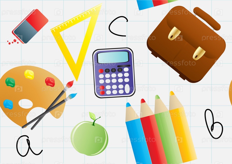 Школьные принадлежности на фоне тетрадного листа. Рисунок
