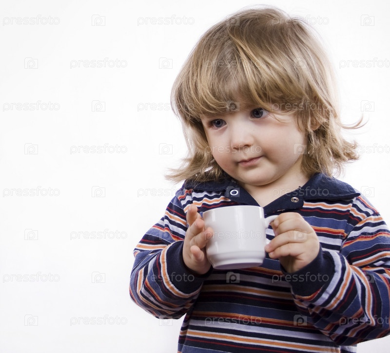 Мальчик с кружкой на белом фоне