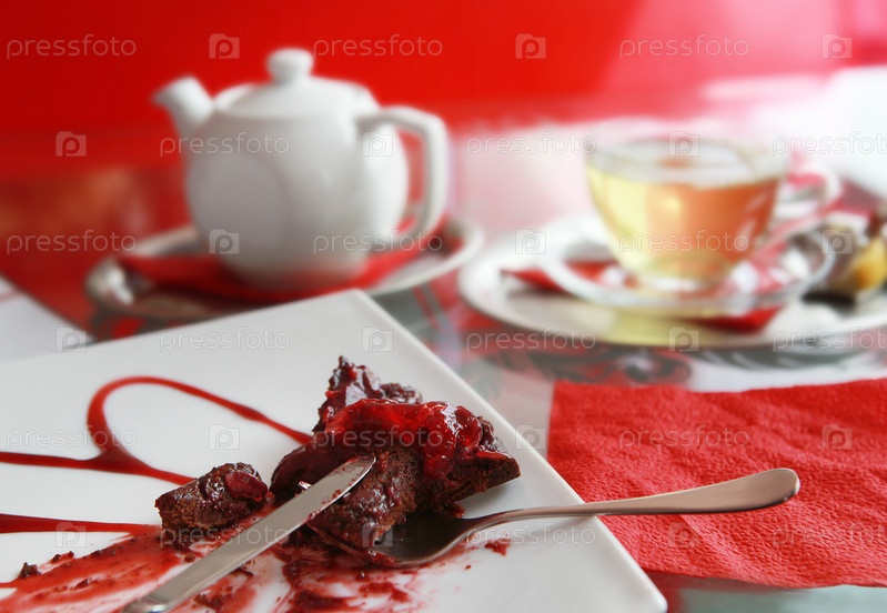 Остатки десерта в тарелке и чайник с чашкой чая на столе