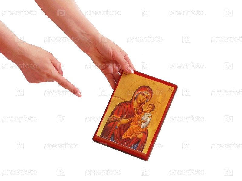Девушка указывает пальцем на икону