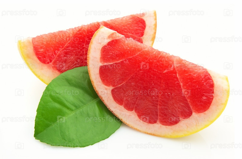 Две дольки грейпфрута с листом на белом фоне