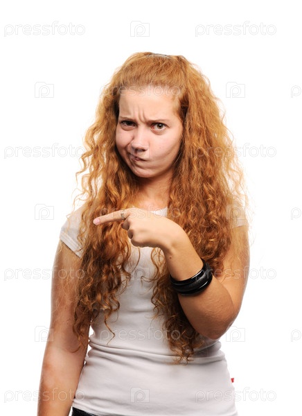 Недовольная девушка указывает пальцем на что-то