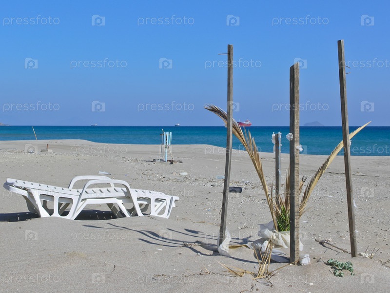 Пустынный пляж с шезлонгом