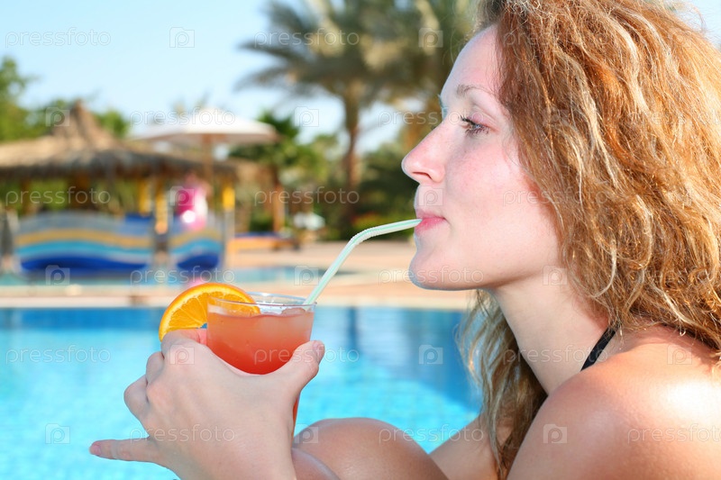 Девушка у бассейна с коктейлем