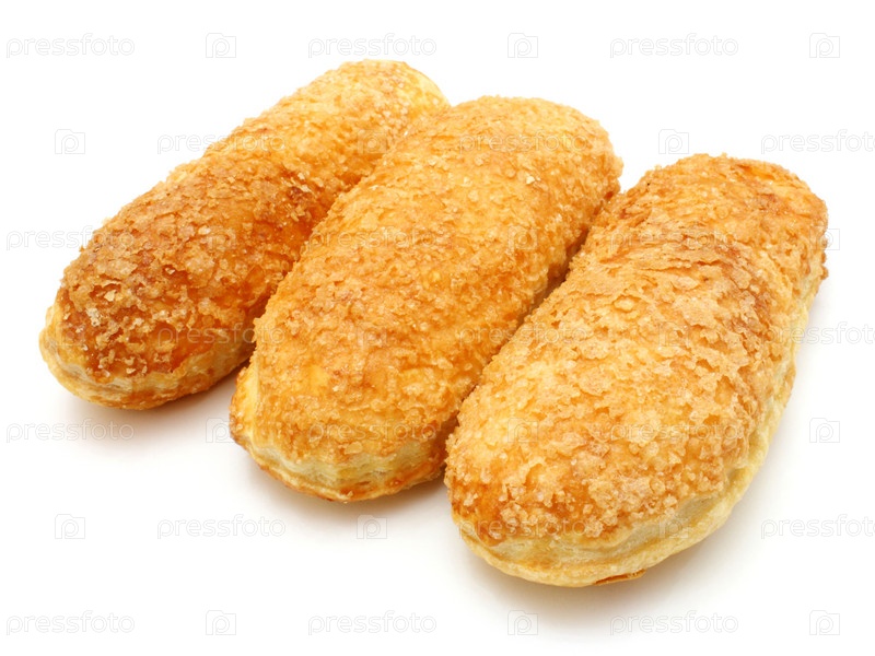 Булочки с румяной корочкой, посыпанные сахаром, на белом фоне