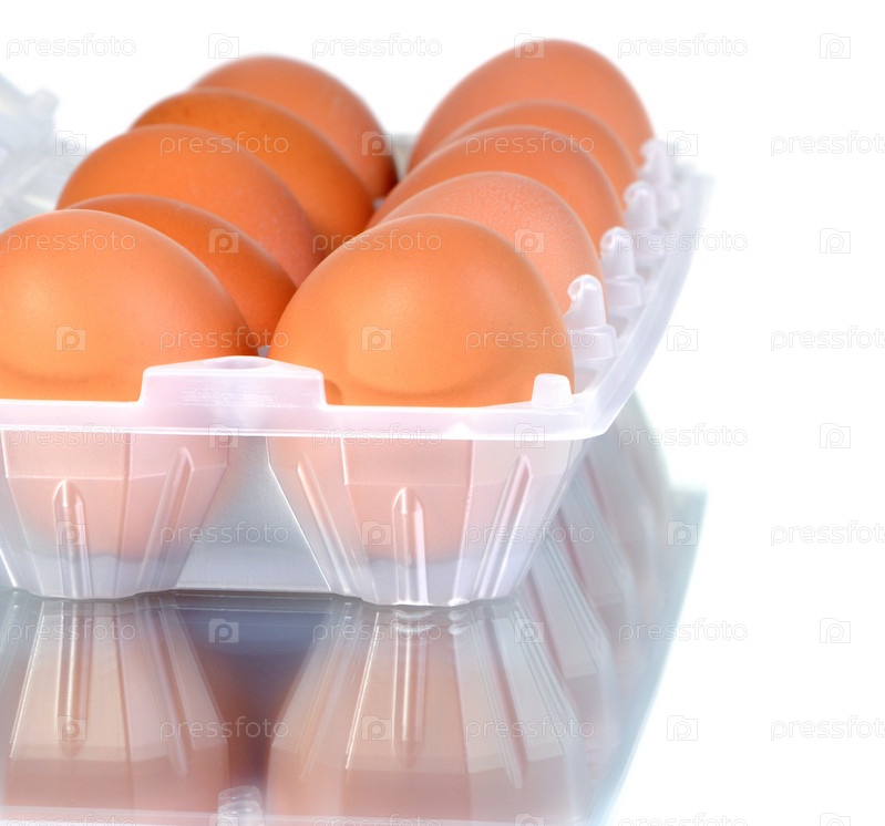 Куриные яйца в упаковке на белом фоне