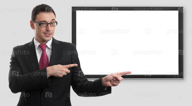 Бизнесмен указывает на пустой экран