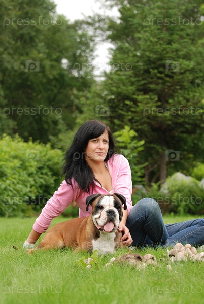 Девушка с собакой сидят на траве