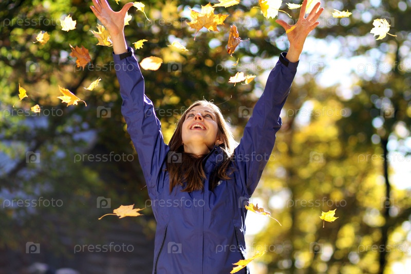 Счастливая девушка бросает осенние листья