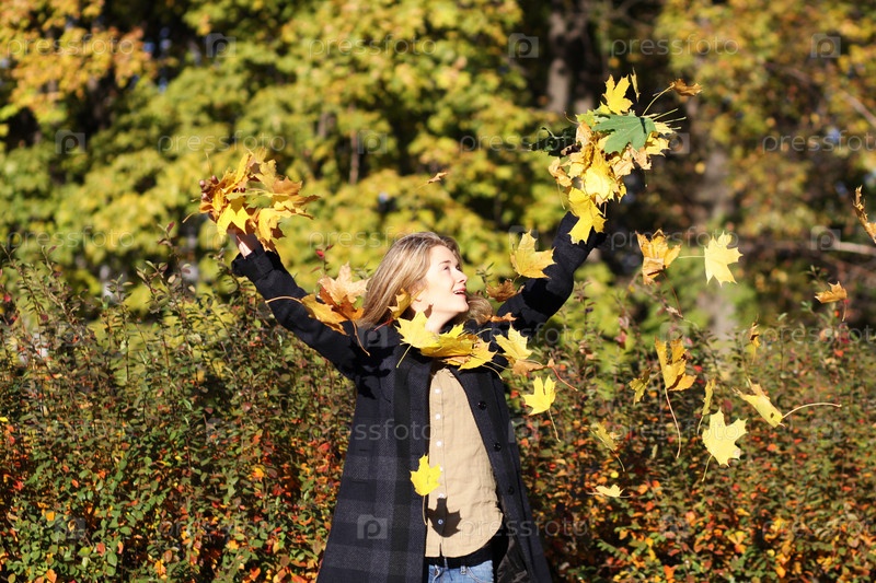 Счастливая девушка бросает осенние листья
