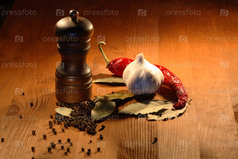 Перцемолка со специями на деревянном фоне