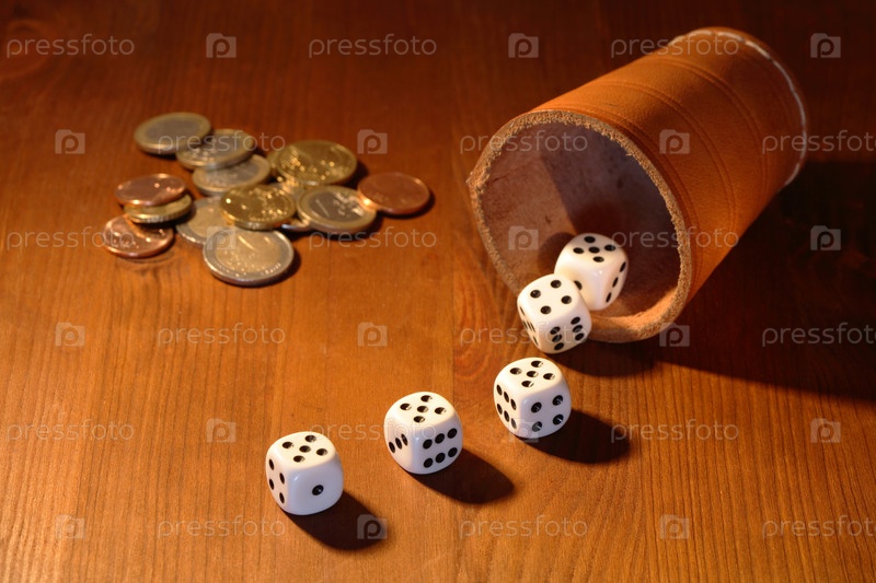 Игральные кости и монеты на деревянном фоне