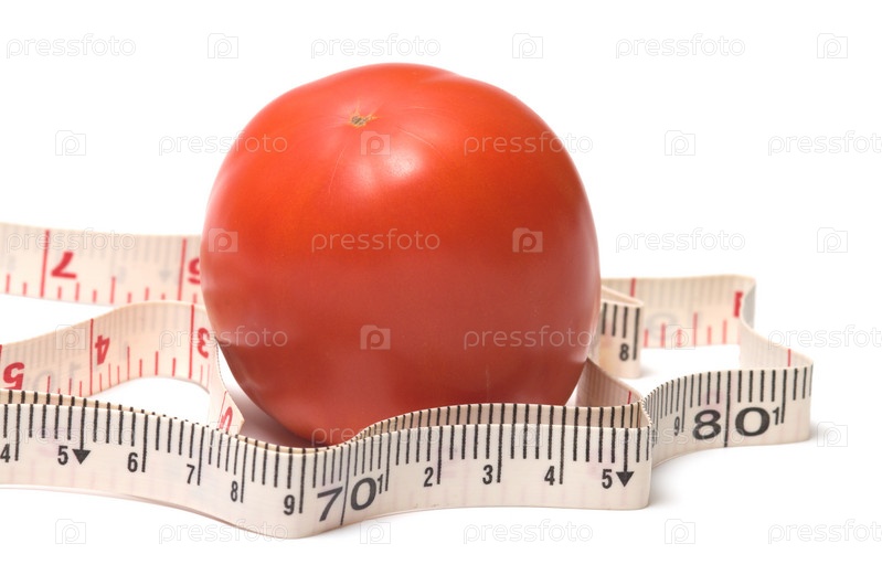 Красный помидор и измерительная лента на белом фоне