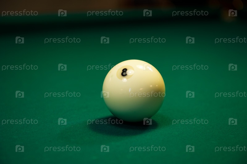 Бильярдный шар с номером восемь на зеленом бильярдном столе