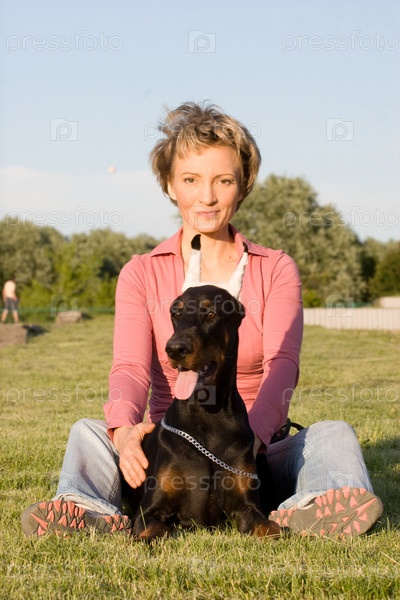 Молодая женщина, сидящая на траве с доберманом