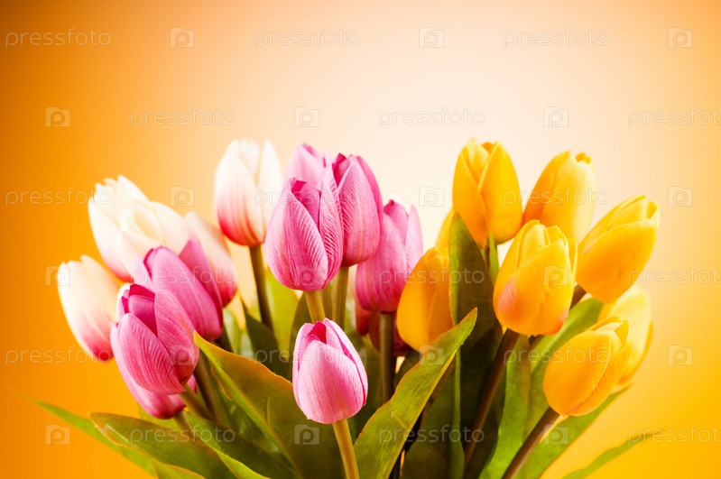 Букет из красочных тюльпанов на желтом фоне