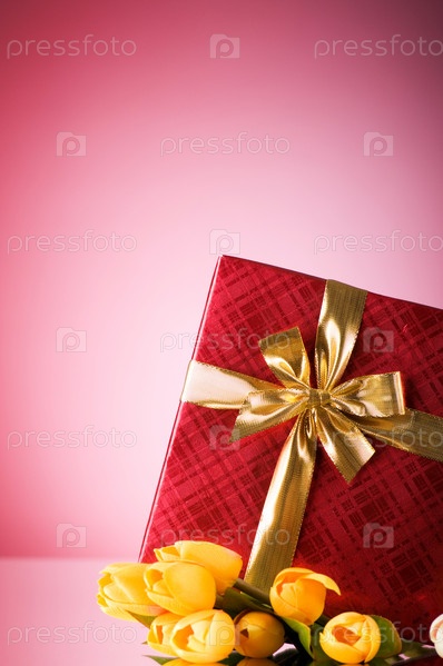 Букет из желтых тюльпанов и подарочная коробка на розовом фоне