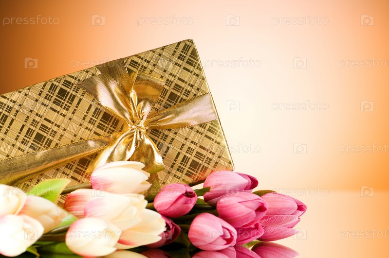 Букет из красочных тюльпанов и подарочная коробка на коричневом фоне