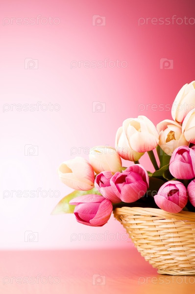 Букет тюльпанов в плетеной корзинке на розовом фоне