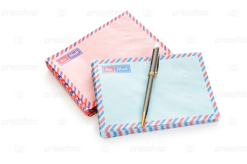 Разноцветные почтовые конверты и ручка на белом фоне