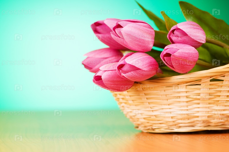 Букет розовых тюльпанов в плетеной корзине