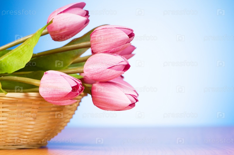 Букет тюльпанов в плетеной корзинке на голубом фоне