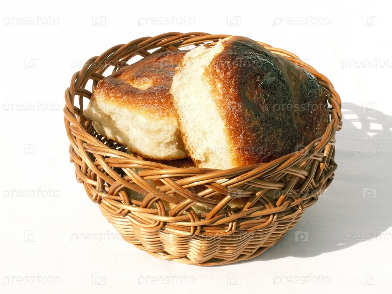 Натюрморт с булочками в плетеной вазе на белом фоне