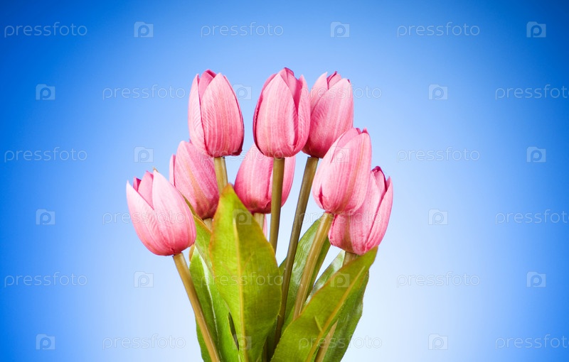 Букет свежих тюльпанов на голубом фоне
