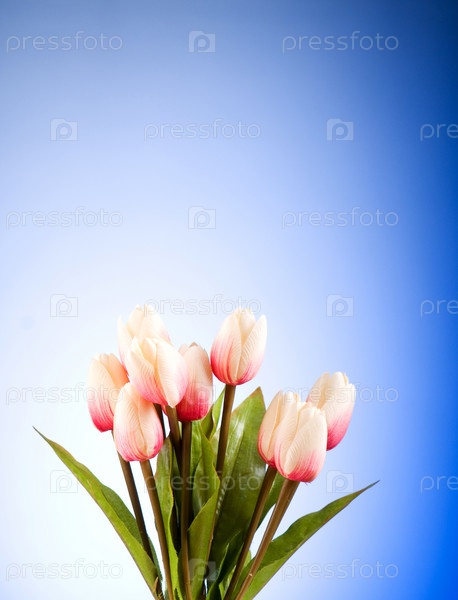 Букет розовых тюльпанов на голубом фоне