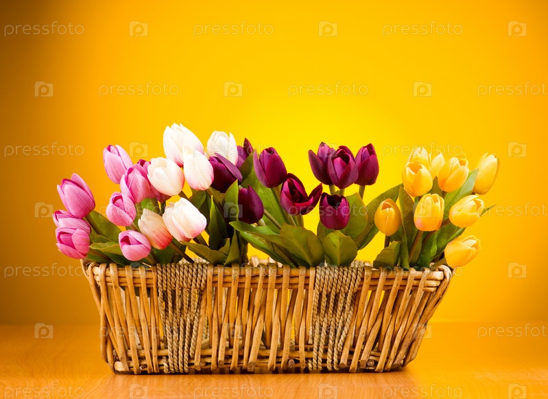 Букет тюльпанов в плетеной корзинке на желтом фоне