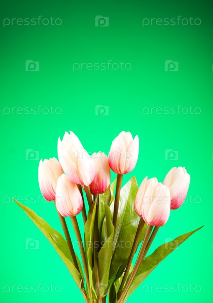 Букет свежих тюльпанов на зеленом фоне