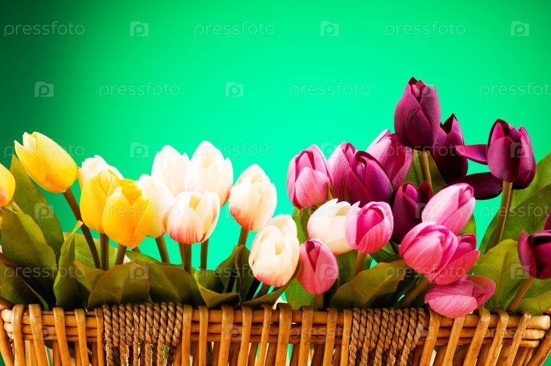 Разноцветные свежие тюльпаны в корзинке на зеленом фоне